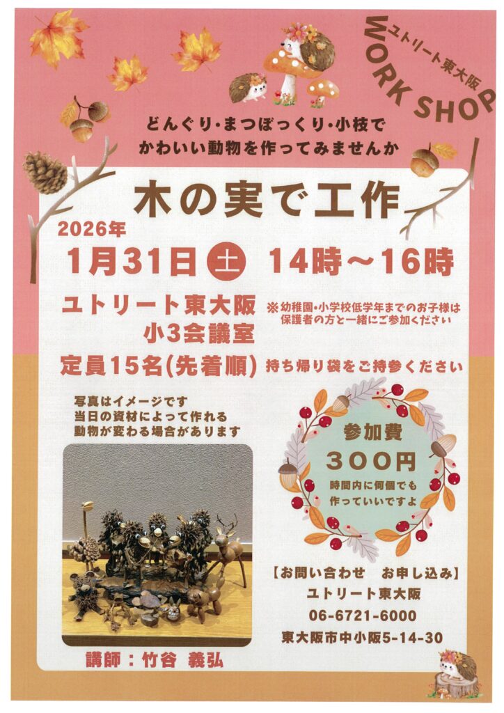 今年度のゆとりー人秋まつりで大好評だった「木の実で工作」が、ユトリート東大阪WORK SHOPで開催されます。