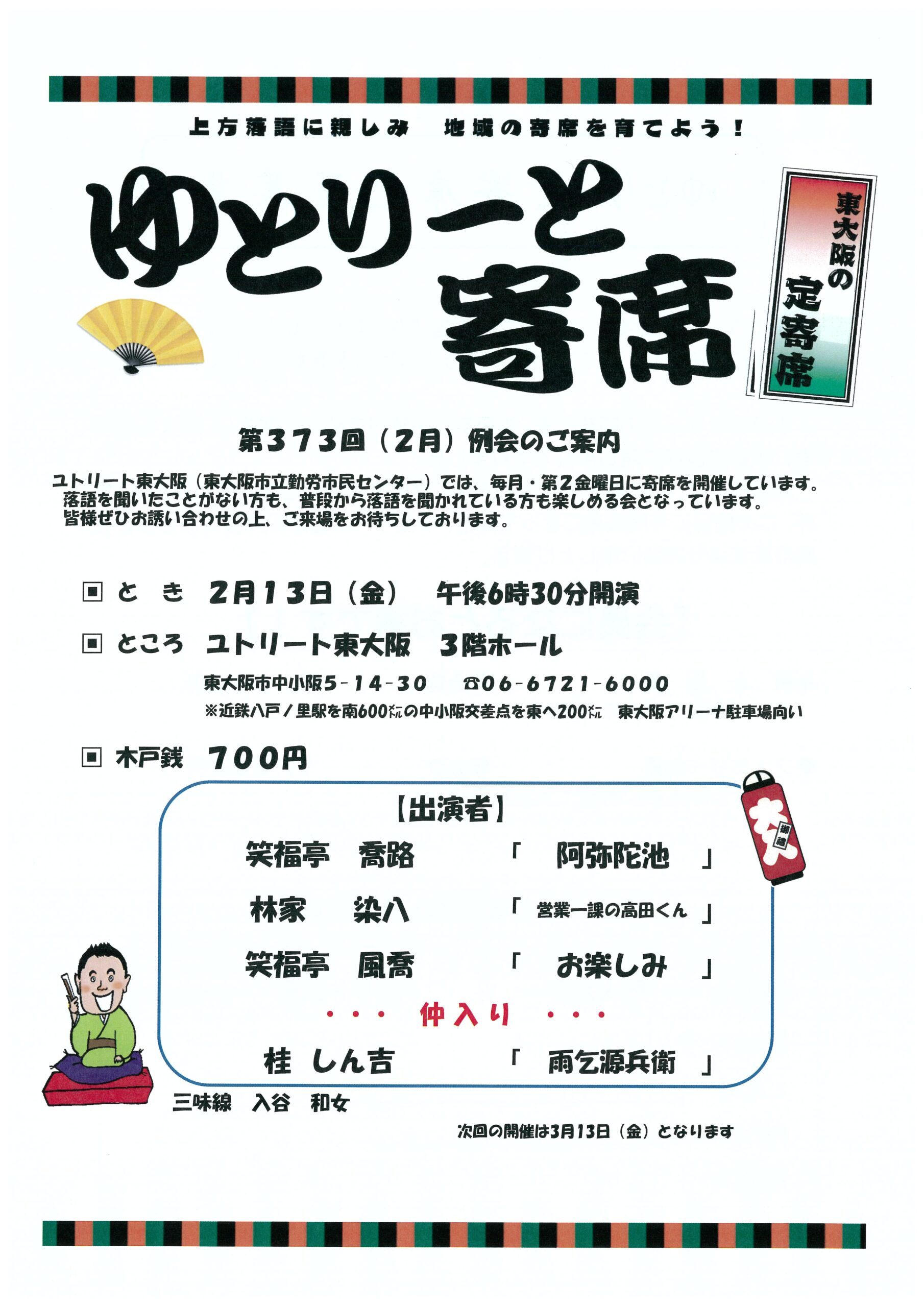ユトリート東大阪(東大阪市立勤労市民センター)では、毎月•第2金曜日に寄席を開催しています。