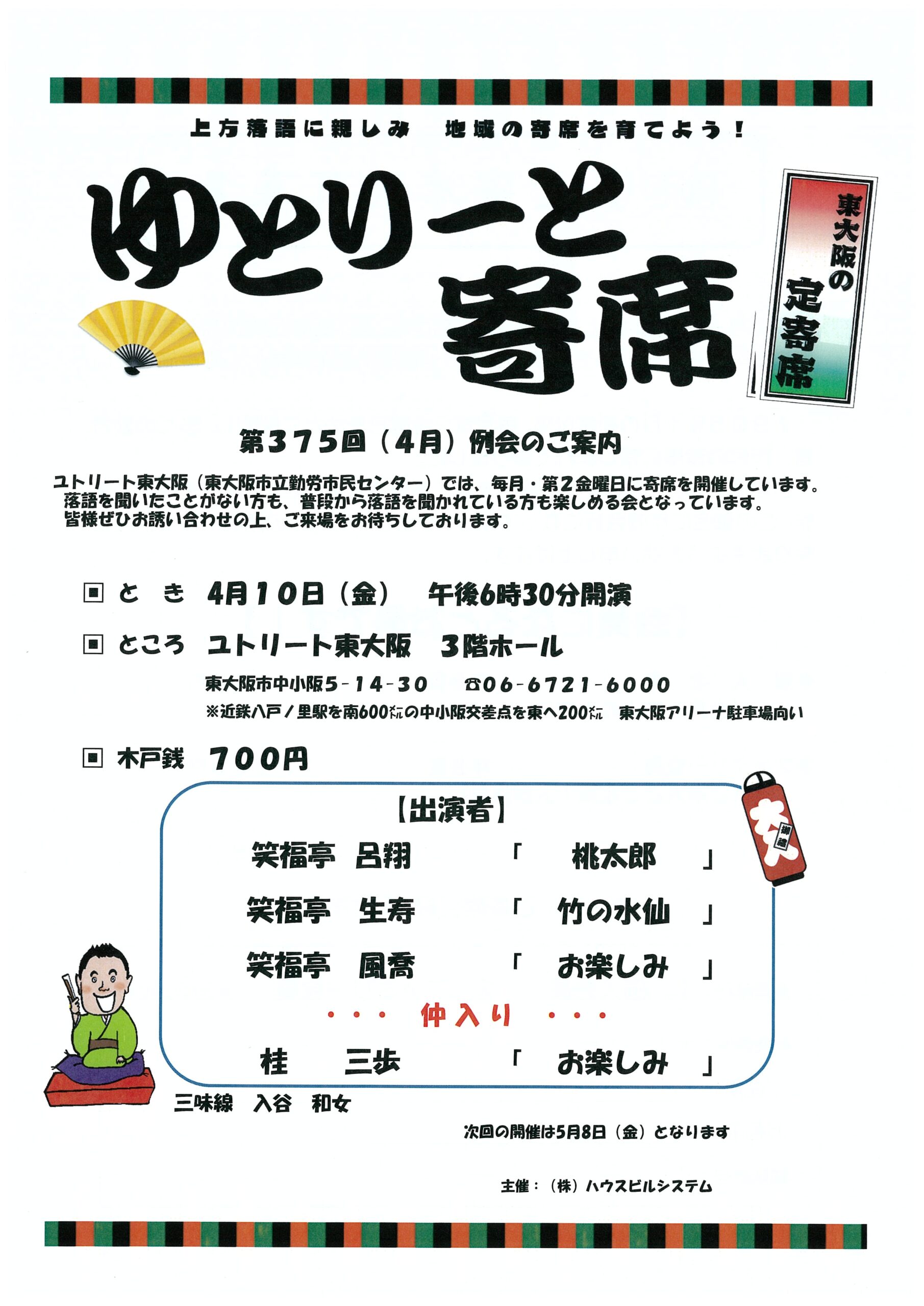 東大阪定寄席「ゆとりーと寄席」第375回(4月)例会のご案内