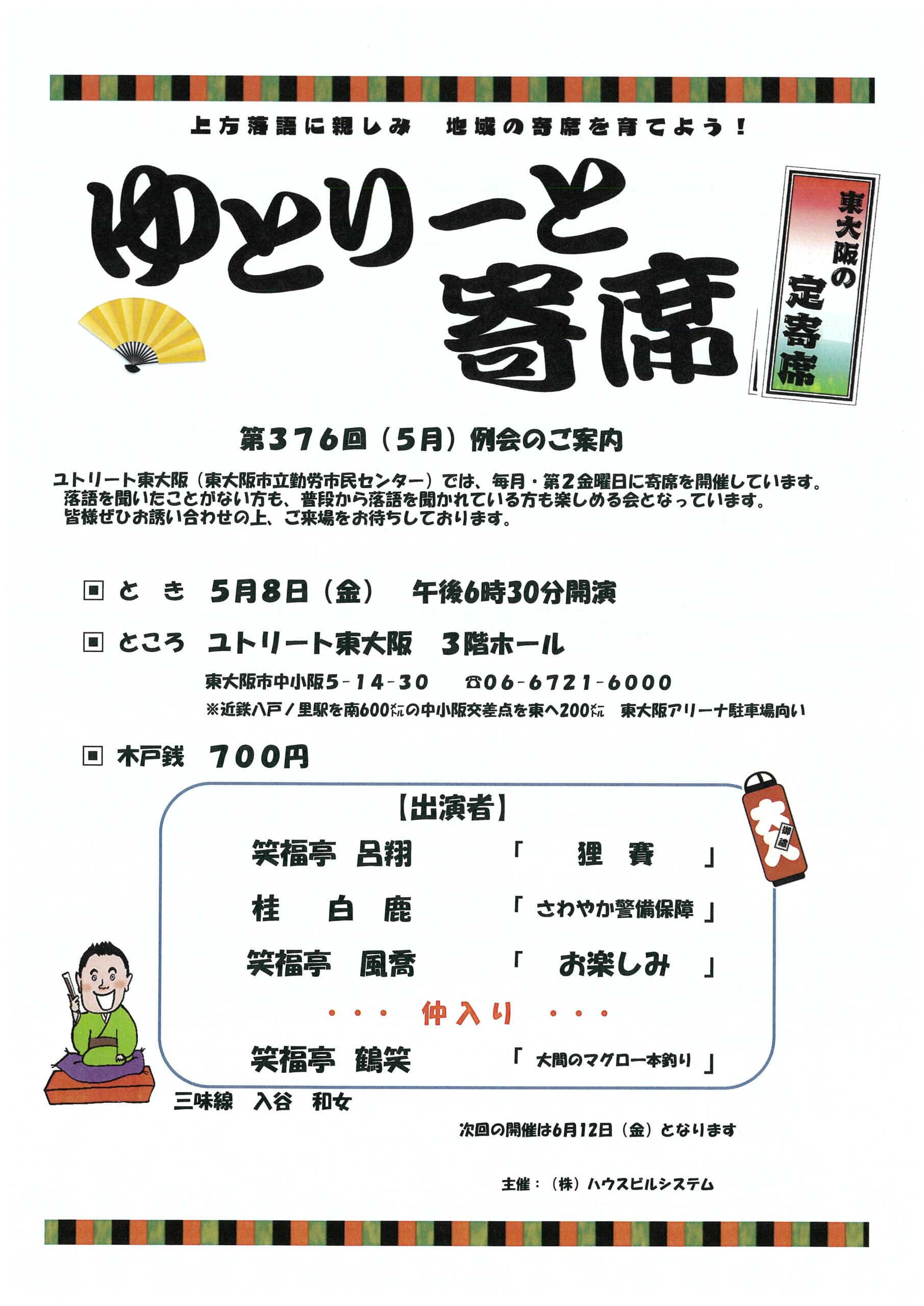 東大阪定寄席「ゆとりーと寄席」第376回(5月)例会のご案内